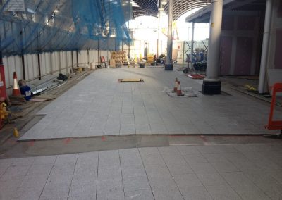 The photographs show the area in front of the existing kiosks after breaking out, during tiling and finally on completion of polishing.