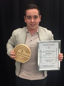 Huge congratulations to Shay McNally on being named Apprentice of Year by Willmott Dixon at their 2017 “Better Together” awards. This is in recognition of the skills and commitment that Shay is displaying and is thoroughly deserved. Well done Shay, you are a credit to the company and to your family.